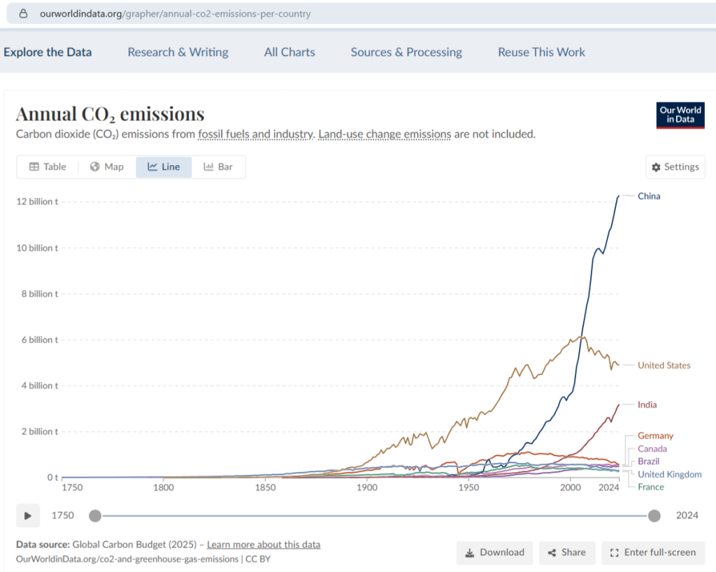 “Our world in data annual CO2 emissions” : https://ourworldindata.org/grapher/annual-co2-emissions-per-country?country=USA~GBR~IND~CHN~FRA~DEU~BRA~CAN